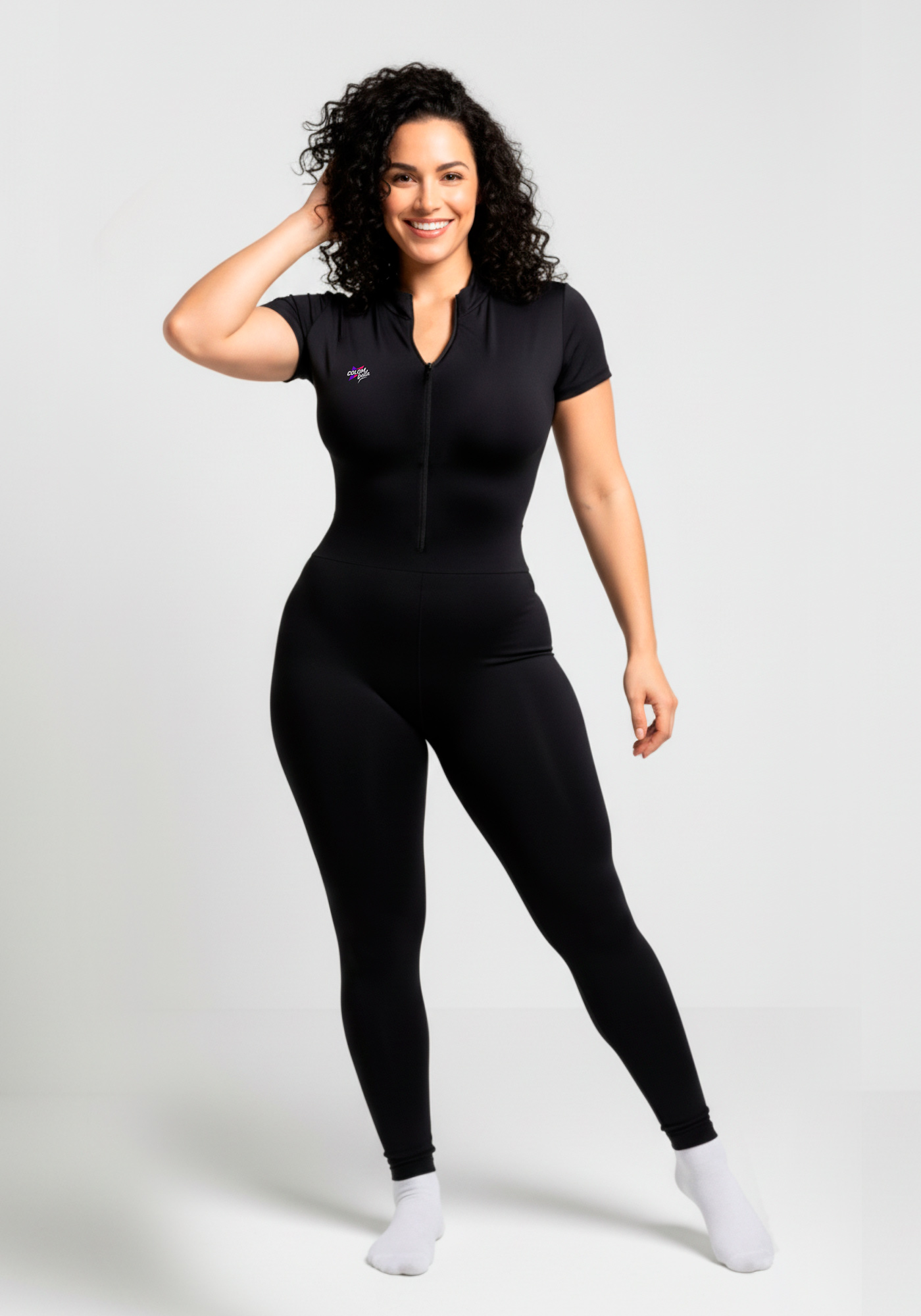 Enterizo negro con manga corta, pierna larga y cierre frontal ajustable.